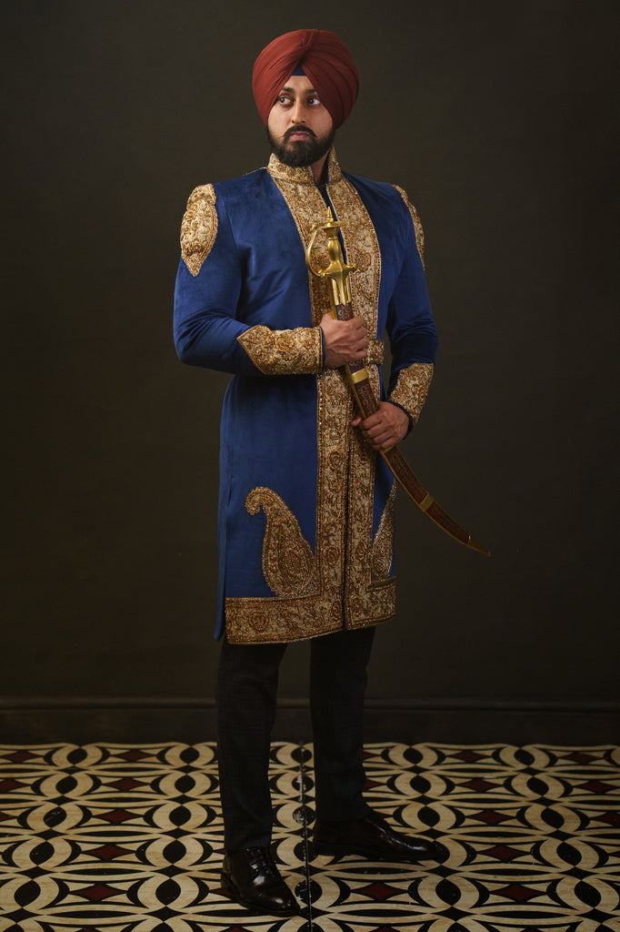 Shervani - Maharaja Bhupinder Inspired Shervani Navy Velvet with Gold Embriodery