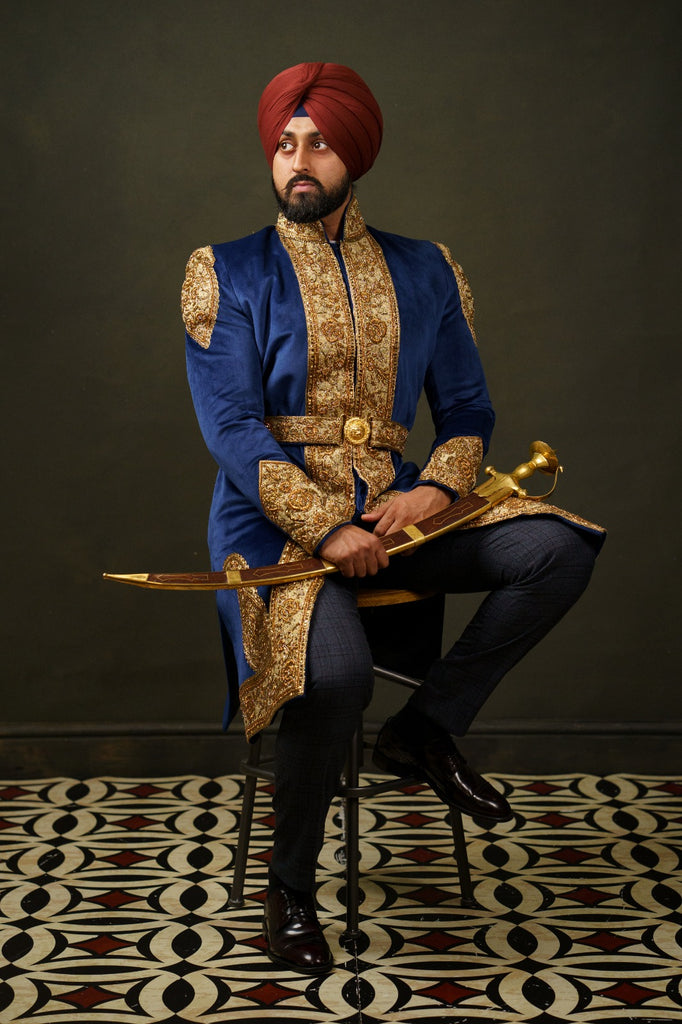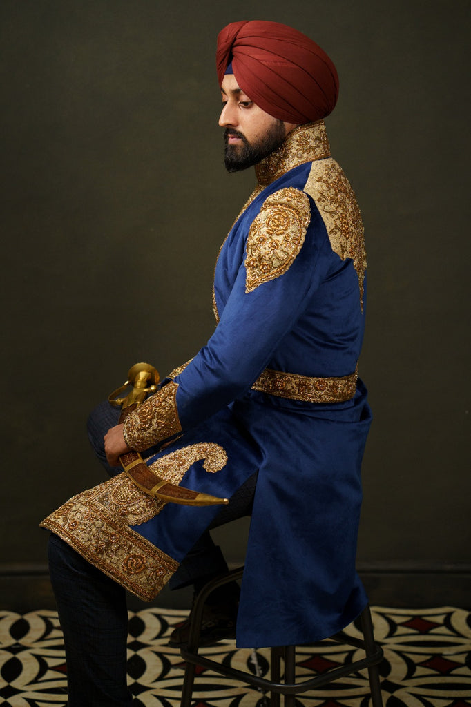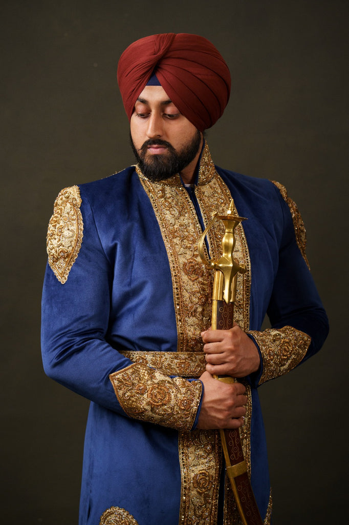 Step into the world of timeless elegance with our exquisite Maharaja Bhupinder Singh inspired shervani collection. Handcrafted on a navy blue velvet base, these regal garments embody opulence and sophistication. Each piece showcases intricate detailing and impeccable craftsmanship, ensuring a truly unique and authentic attire. Perfect for weddings, special occasions, or when you want to make a majestic fashion statement. Purchase this exquisite shervani on our website today and embrace the splendor of a bygone era. Discover the epitome of grace, elegance, and tradition now.