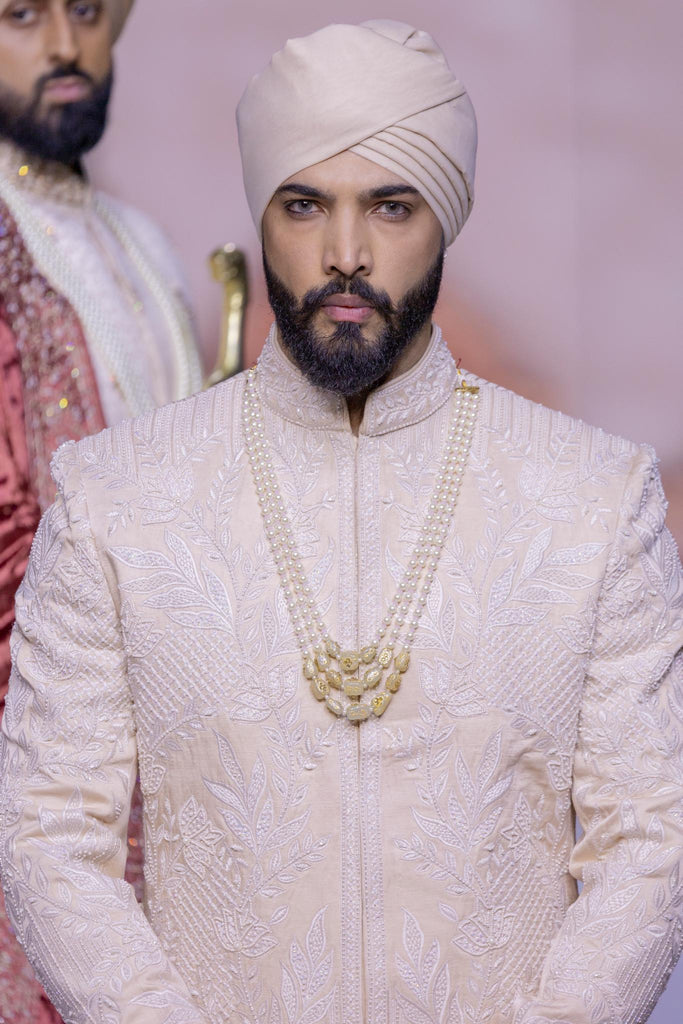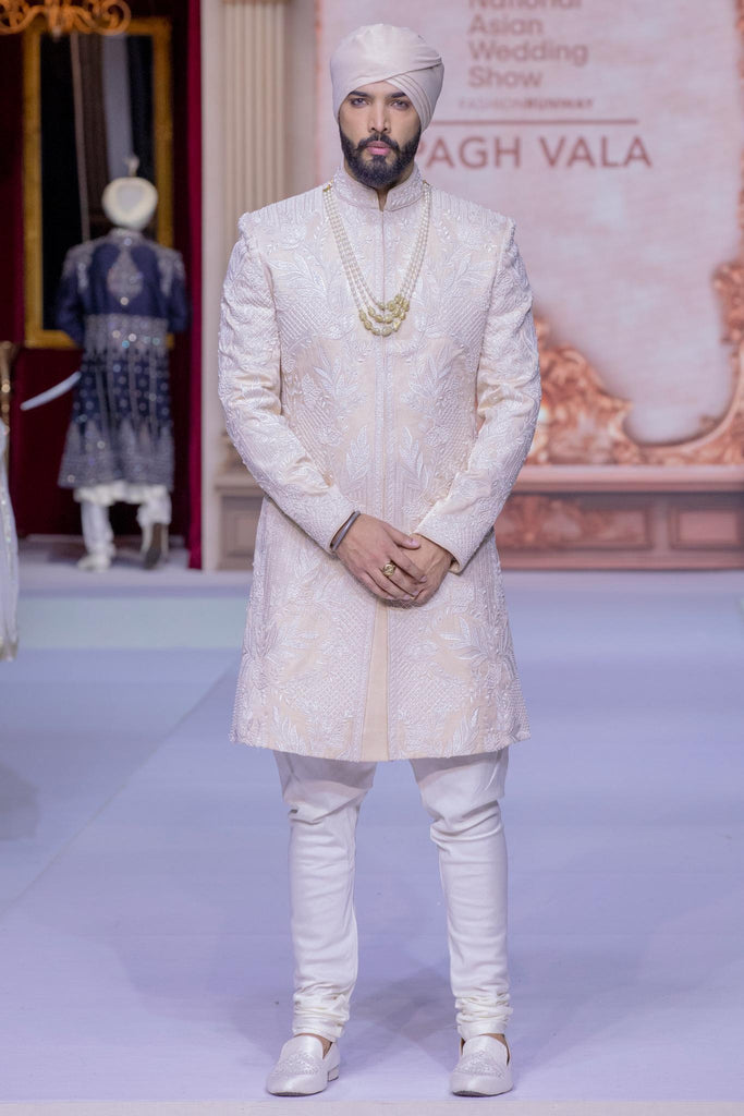 Explore our exquisite collection of a single Sherwani with hand work , meticulously hand-embroidered to perfection. This unique Shervani showcases an elegant design, complete with a Pallah, Mojeh, Chooridarh Pyjami, and Turban Material. Elevate your style with this standout Shervani, ideal for making a lasting impression at on your wedding day.