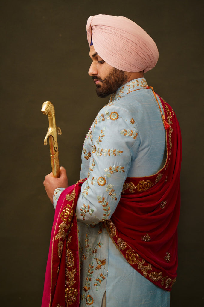 Indulge in timeless elegance with our handcrafted Light Blue Shervani. Adorned with exquisite gold and blue handwork, this captivating garment is a true masterpiece. Complete with a Pink Pallah, it offers a striking contrast that adds a touch of sophistication. Don't miss the opportunity to own this meticulously crafted shervani, designed to make you stand out on special occasions. Experience the allure of traditional fashion and elevate your style today. Embrace the charm of a handcrafted shervani and make a statement that leaves a lasting impression. Purchase your very own Baby Blue Shervani with Gold and Blue handwork, and let your style shine.