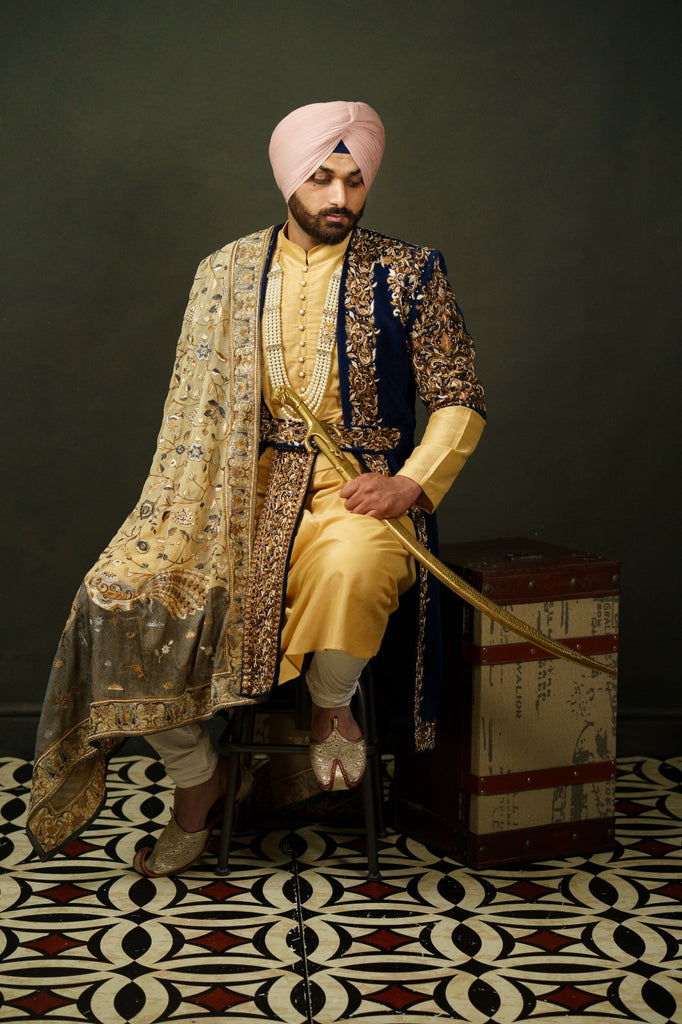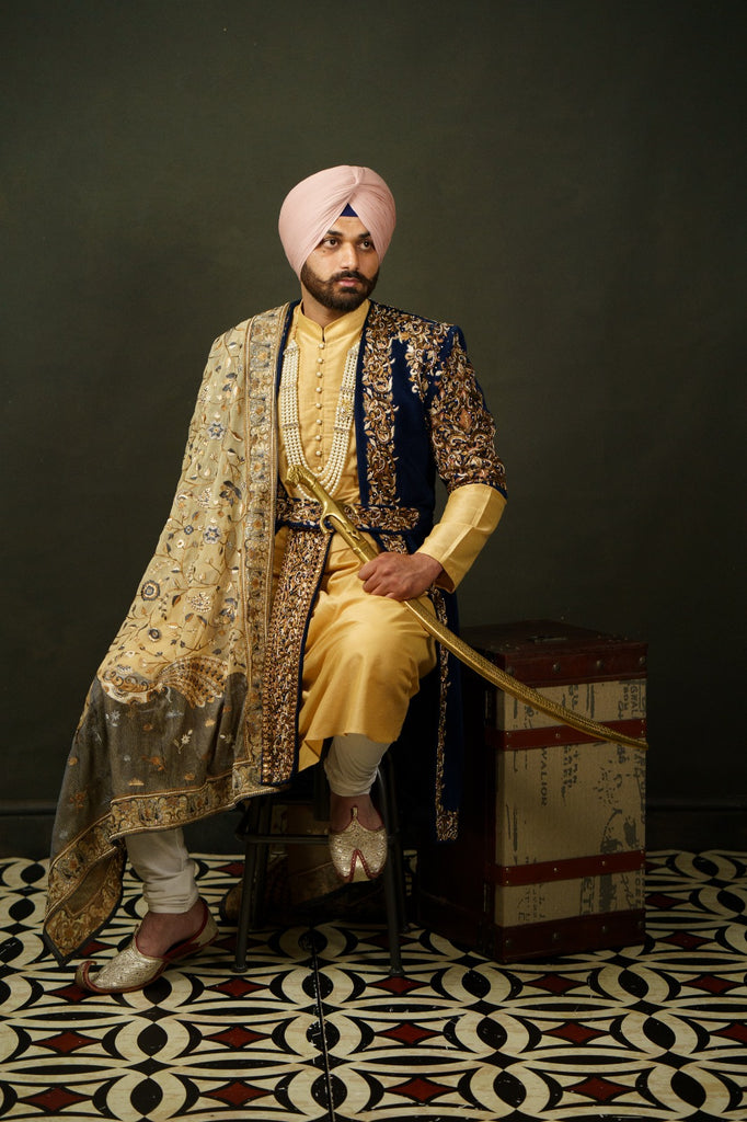 Step into a world of royal opulence with our handcrafted shervani collection, inspired by the legendary Punjabi Maharajas. This Shervani features exquisite Dabka and Zari work on a luxurious velvet base, complete with a Pallah, Mojeh, Chooridarh Pyjami, and Turban Material. Crafted with meticulous care, each shervani exudes elegance and regality. Made by skilled artisans, these garments showcase intricate detailing and impeccable craftsmanship, ensuring a truly one-of-a-kind masterpiece. Embrace the heritage and grandeur of Punjabi Maharajas by owning one of these magnificent shervanis. Experience the allure of royal fashion and elevate your style today.